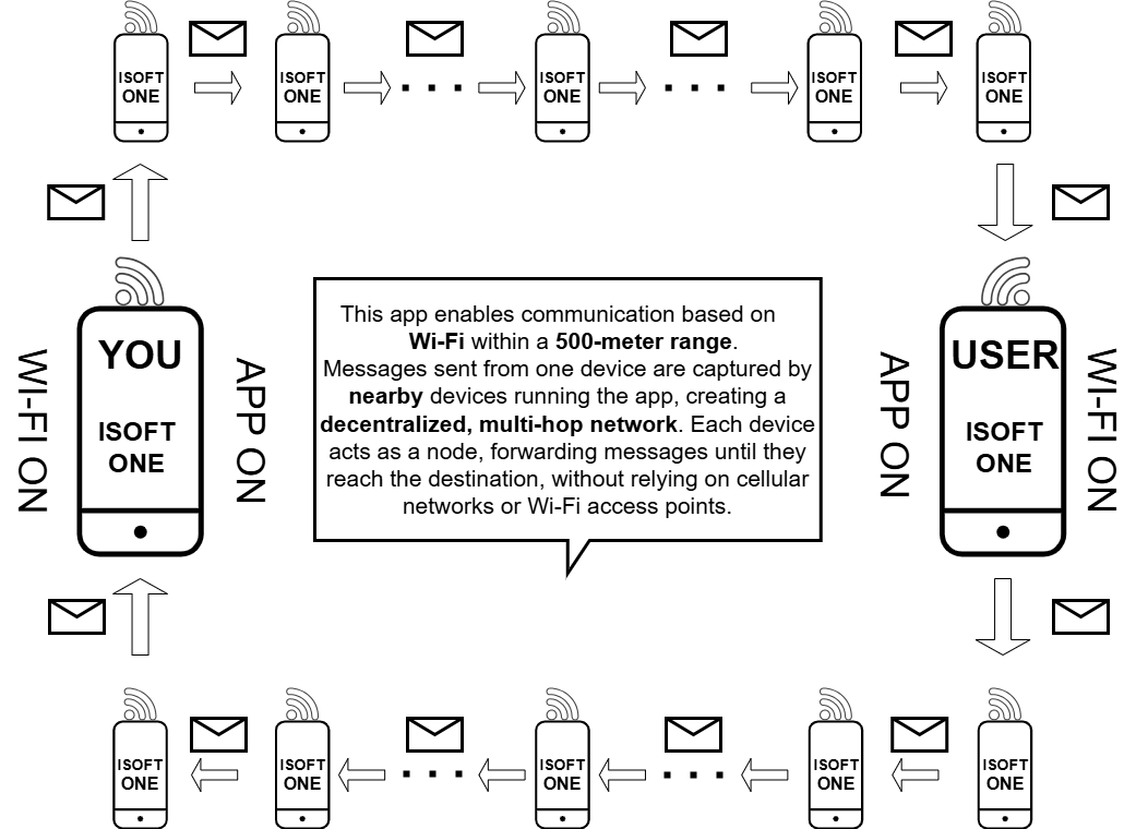 ISOFT.one app communicates with surrounding smartphones without using mobile networks or wi-fi networks, we managed to create a new virtual network that uses only users phones.